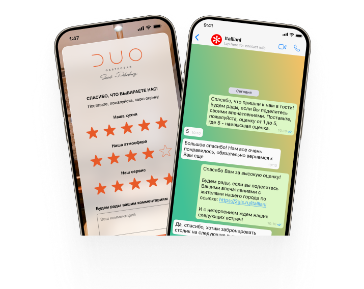 Даёт возможность бесплатно отправлять гостям сообщения и собирать обратную связь после визита/заказа.