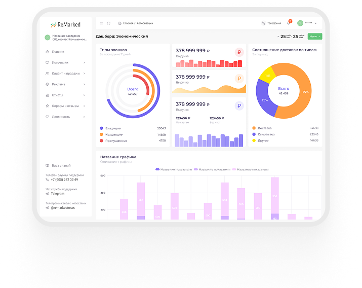 Подробная аналитика по визитам, продажам и коммуникациям.